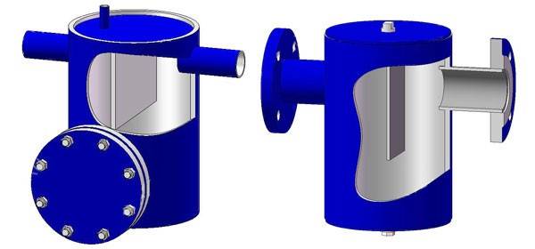 Корпус механизма выполняется в форме полого цилиндра, к нему приварено два отвода — для входа и выхода среды. Внутри расположен сетчатый фильтр, для доступа к которому предназначен лючок, и отстойник. Прибор для очистки приваривают к трубе или привинчивают с помощью фланцев.